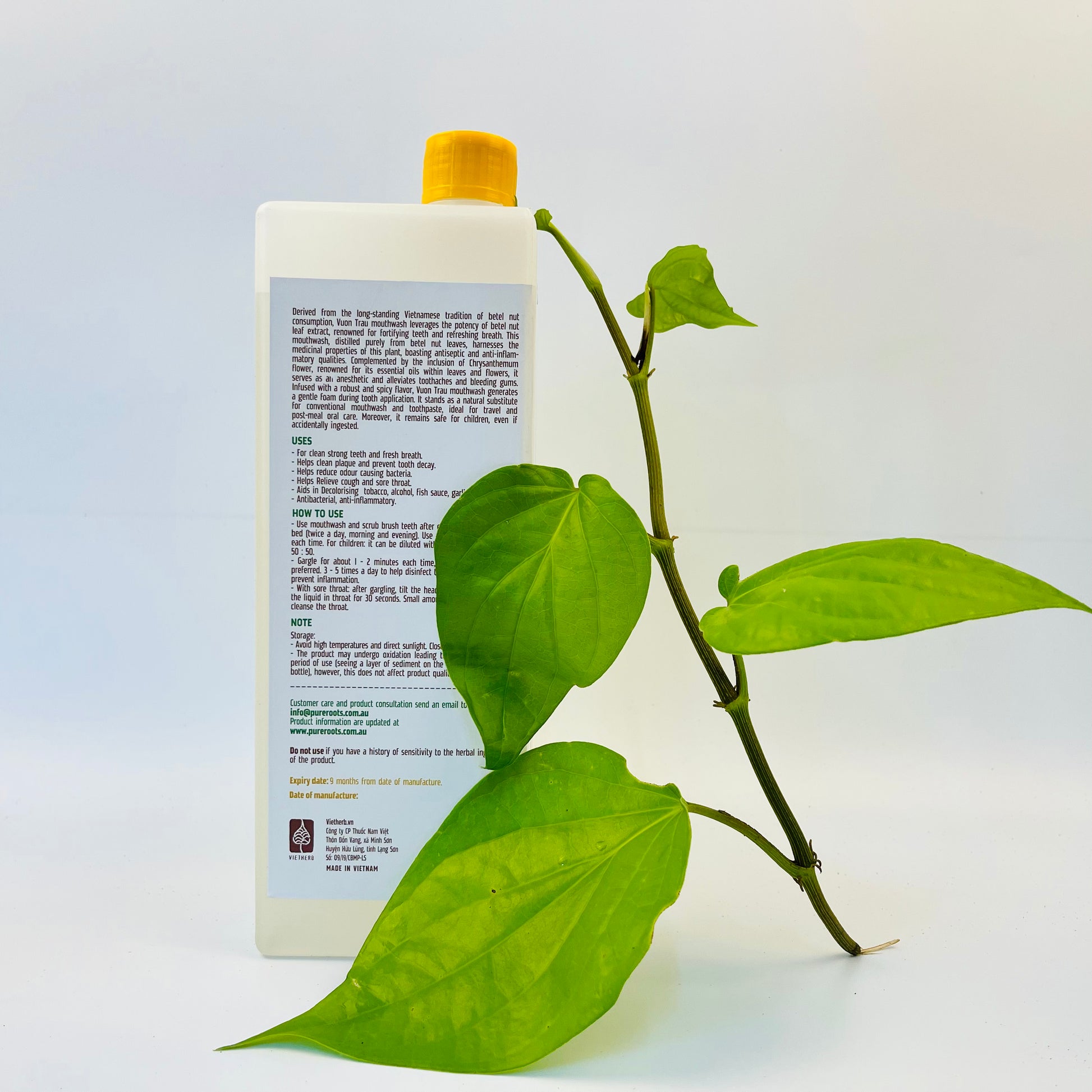 Description: Vuon Trau mouthwash, inspired by Vietnamese betel nut tradition, offers a natural alternative to conventional oral care products. This pure distillation of betel nut leaves and chrysanthemum flower provides antiseptic and anti-inflammatory benefits.